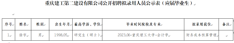 附件:伟德体育第二建设有限公司2023年公开招聘拟录用人员公示表