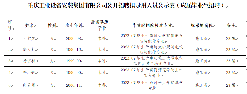 附件:重庆工业设备安装集团有限公司2023年公开招聘拟录用人员公示表