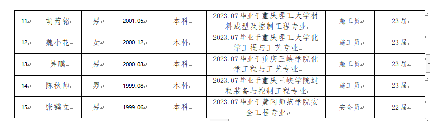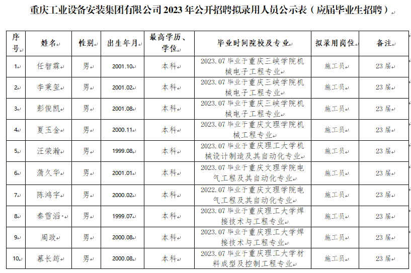 附件:重庆工业设备安装集团有限公司2023年公开招聘拟聘人员公示表