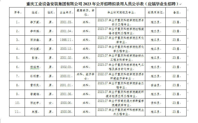 附件:重庆工业设备安装集团有限公司2023年公开招聘拟聘人员公示表
