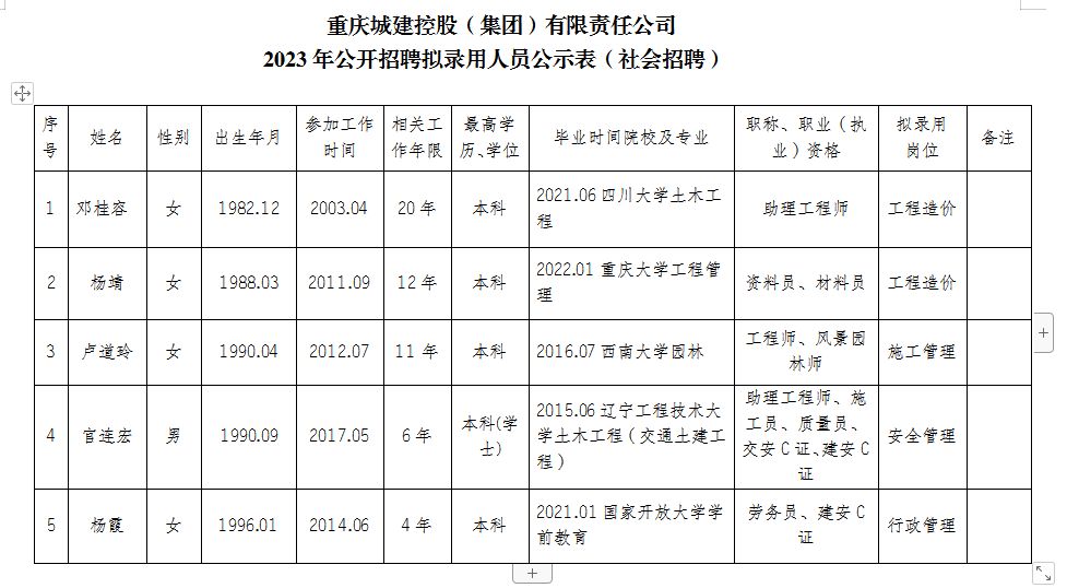 附件:重庆城建控股(集团)有限责任公司2023年公开招聘拟录用人员公示表