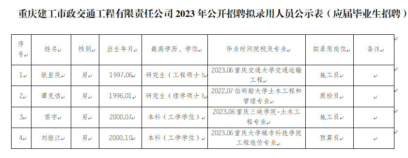 附件:伟德体育市政交通工程有限责任公司2023年招聘拟录用人员公示表