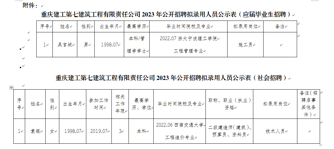 附件:伟德体育第七建筑工程有限责任公司2023年公开招聘拟录用人员公示表