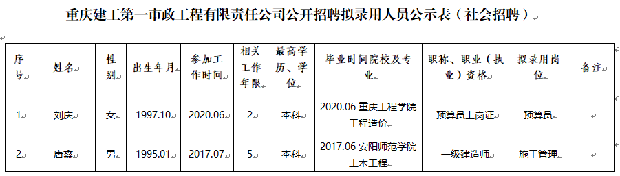 附件:伟德体育第一市政工程有限责任公司2022年公开招聘拟录用人员公示表