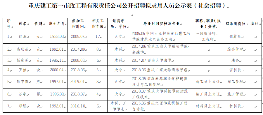 附件:伟德体育第一市政工程有限责任公司2022年公开招聘拟录用人员公示表