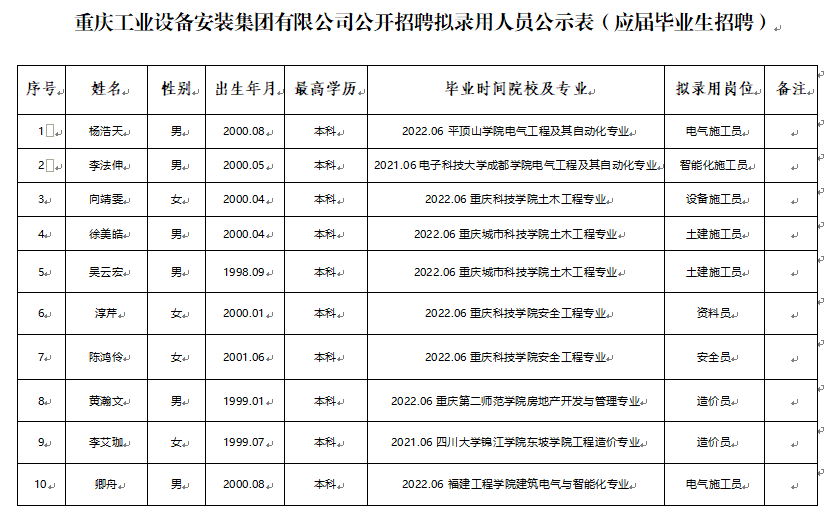 附件:重庆工业设备安装集团有限公司2022年公开招聘拟聘人员公示表