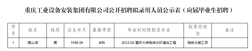 附件:重庆工业设备安装集团有限公司2022年公开招聘拟录用人员公示表