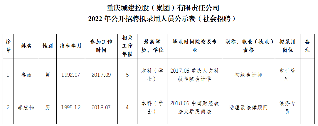 附件:重庆城建控股(集团)有限责任公司2022年公开招聘拟聘人员公示表
