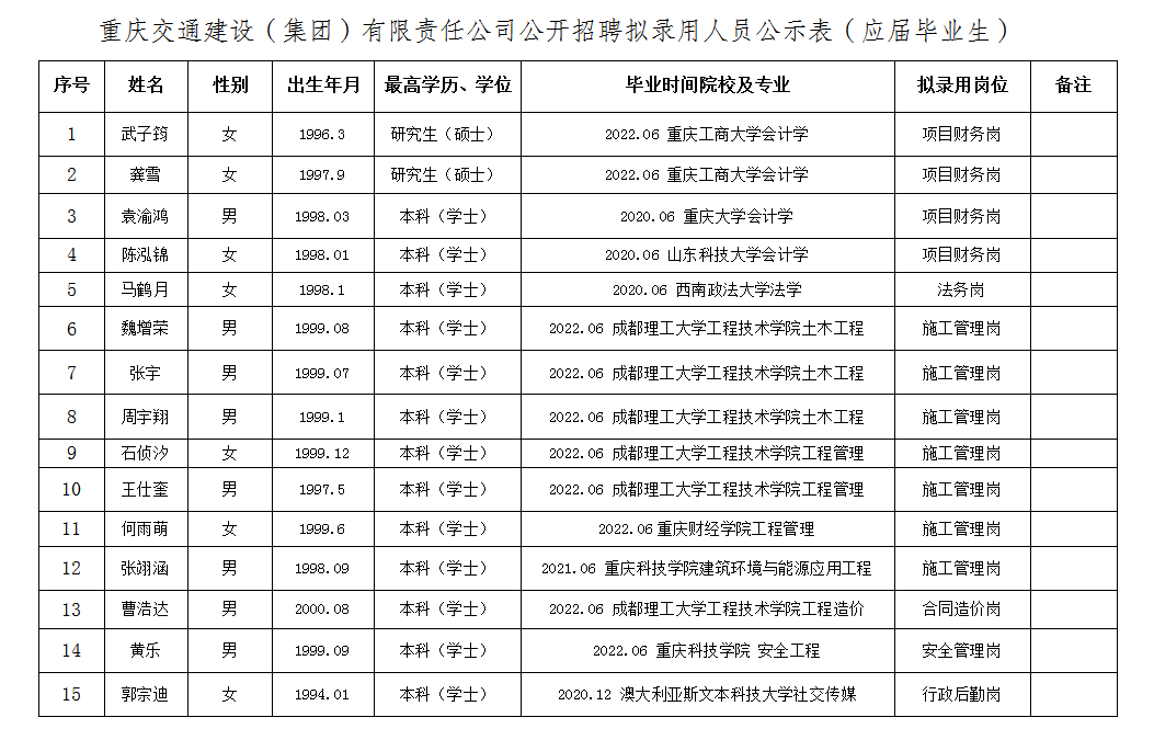 附件:重庆交通建设(集团)有限责任公司2022年公开招聘拟聘人员公示表