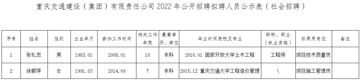 附件:重庆交通建设(集团)有限责任公司2022年公开招聘拟聘人员公示表