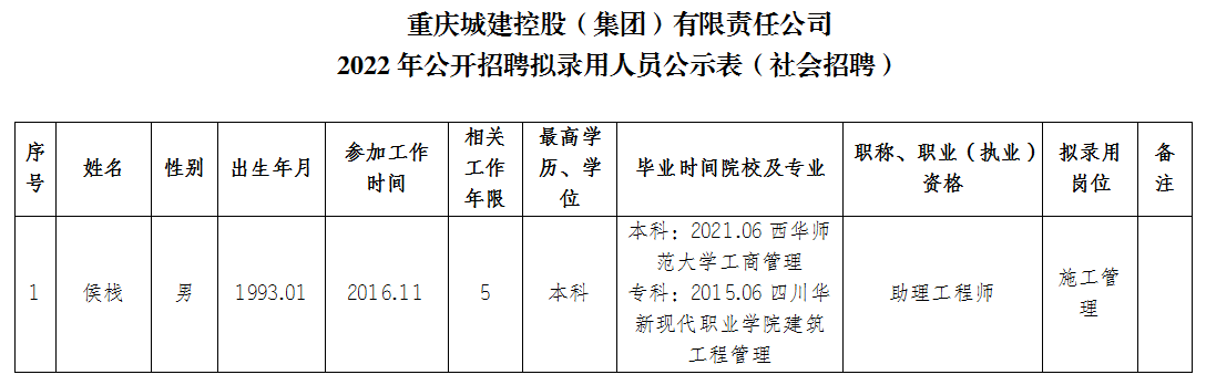 附件:重庆城建控股(集团)有限责任公司2022年公开招聘拟录用人员公示表