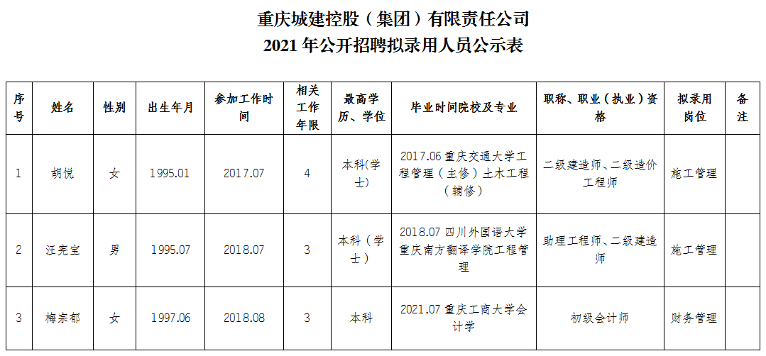 附件:重庆城建控股(集团)有限责任公司2021年公开招聘拟聘人员公示表
