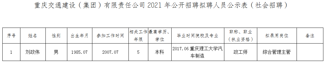 附件:重庆交通建设(集团)有限责任公司2021年公开招聘拟录用人员公示表