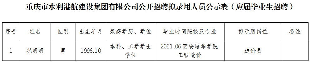 附件:重庆市水利港航建设集团有限公司2021年公开招聘拟录用人员公示表