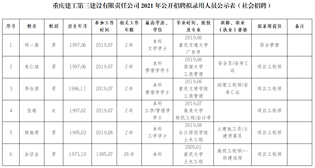 附件:伟德体育三建公司2021年公开招聘拟录用人员公示表