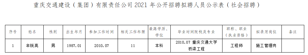 附件:重庆交通建设(集团)有限责任公司2021年公开招聘拟聘人员公示表