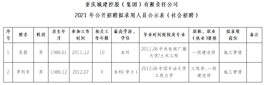 附件:重庆城建控股(集团)有限责任公司2021年公开招聘拟录用人员公示表