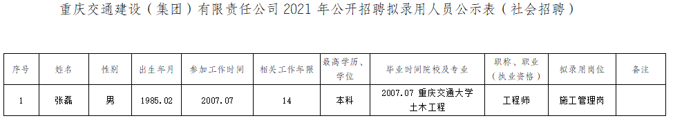 附件:重庆交通建设(集团)有限责任公司2021年公开招聘拟录用人员公示表