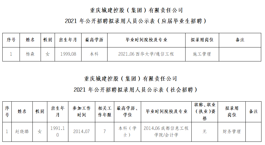 附件:重庆城建控股(集团)有限责任公司2021年公开招聘拟录用人员公示表