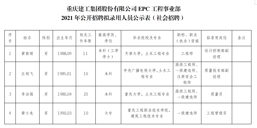 附件:伟德体育集团股份有限公司EPC工程事业部2021年公开招聘拟录用人员公示表