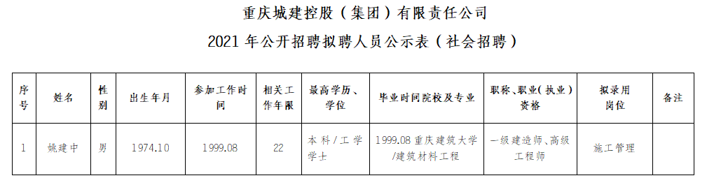 附件:重庆城建控股(集团)有限责任公司2021年公开招聘拟录用人员公示表