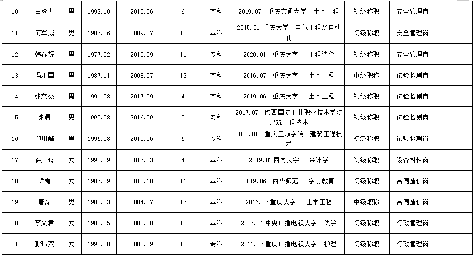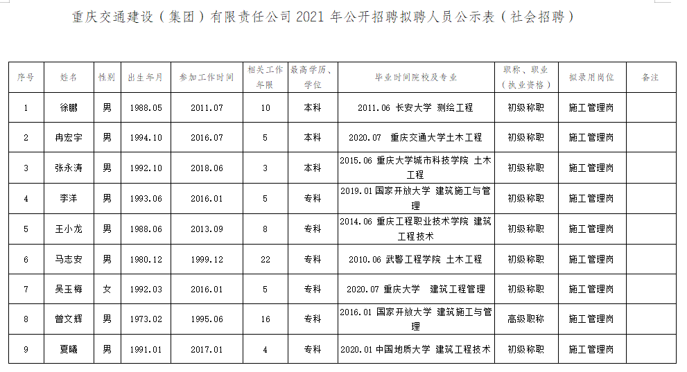 附件:重庆交通建设(集团)有限责任公司2021年公开招聘拟聘人员公示表