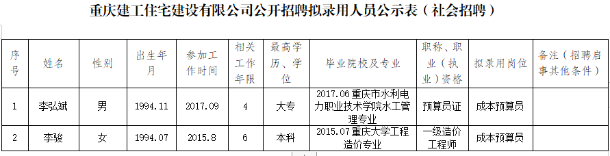 伟德体育住宅建设有限公司2021年公开招聘拟录用人员公示