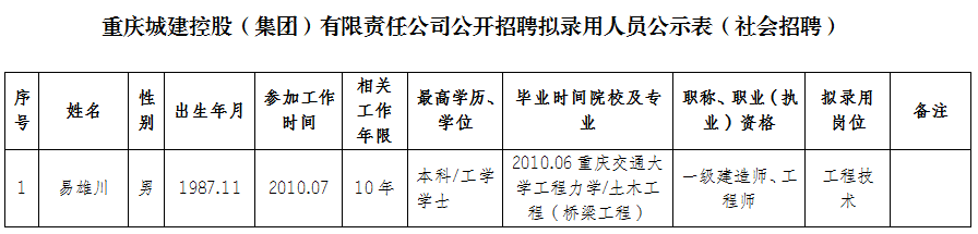 附件:重庆城建控股(集团)有限责任公司2020年公开招聘拟聘人员公示表