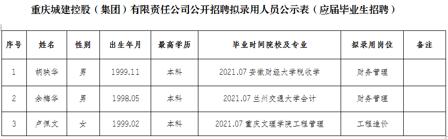 附件:重庆城建控股(集团)有限责任公司2020年公开招聘拟聘人员公示表