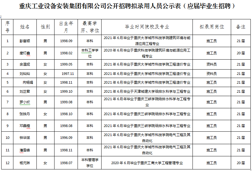 附件:重庆工业设备安装集团有限公司2020年公开招聘拟聘人员公示表
