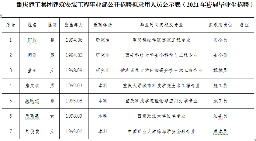 附件:伟德体育集团建筑安装工程事业部2021年公开招聘拟聘人员公示表