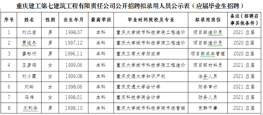 附件:伟德体育第七建筑工程有限责任公司2020年公开招聘拟聘人员公示表