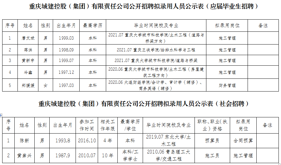 附件:重庆城建控股(集团)有限责任公司2020年公开招聘拟聘人员公示表