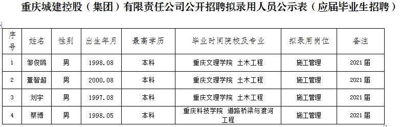 附件:重庆城建控股(集团)有限责任公司2020年公开招聘拟聘人员公示表
