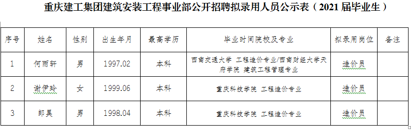 附件:伟德体育集团建筑安装工程事业部2020年公开招聘拟聘人员公示表