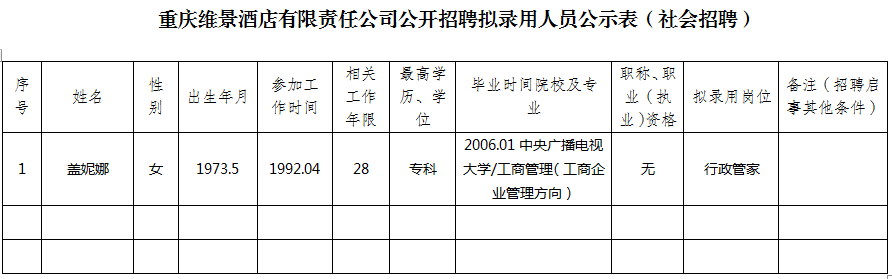附件:重庆维景酒店公司2020年公开招聘拟聘人员公示表