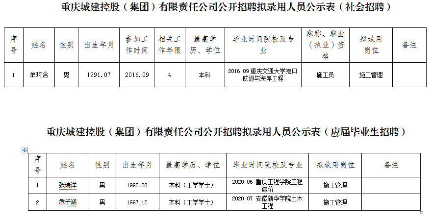 附件:重庆城建控股(集团)有限责任公司2020年公开招聘拟聘人员公示表