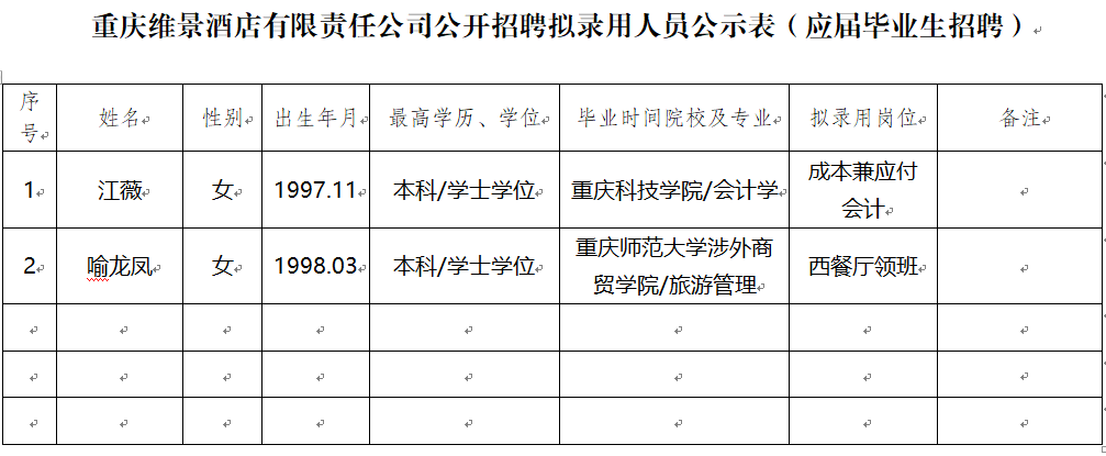 附件:重庆维景酒店公司2020年公开招聘拟聘人员公示表