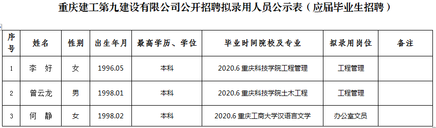 附件:伟德体育第九建设有限公司2020年公开招聘拟录用人员公示表