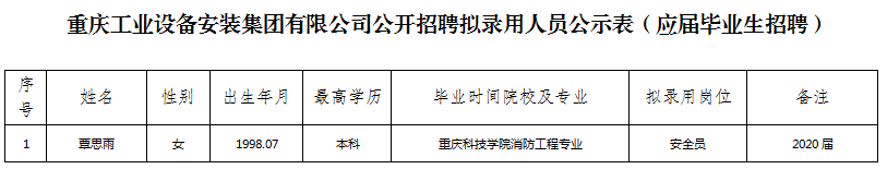 附件:重庆工业设备安装集团有限公司2020年公开招聘拟聘人员公示表