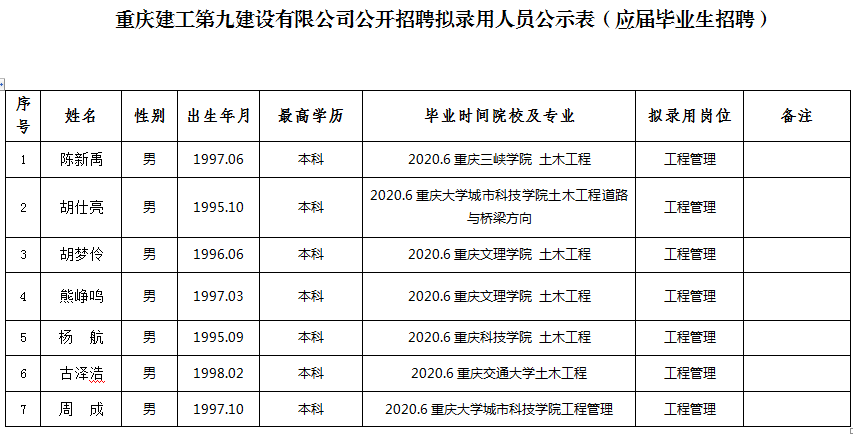 附件:伟德体育第九建设有限公司2020年公开招聘拟聘人员公示表
