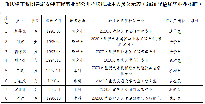 附件:伟德体育集团建筑安装工程事业部2020年公开招聘拟录人员公示表