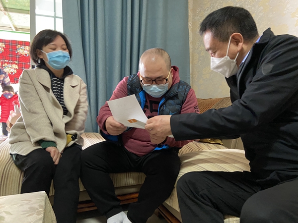 3月12日,在这个播种希望的特别节日里,交建集团工会、团委人员和志愿者们一起再次来到了付翰宁的家中,送去了建工集团党委的关心和慰问,这一次,我们见到了结束长达40多天一线战“疫”任务已经回家的郑小亚,她激动的接过了建工集团党委的慰问信,她说:“感谢组织的关心,在一线战疫的40多天里,组织给予了我们这个家庭莫大的关心和鼓励,大家帮助付翰宁分担工作,公司安排他在家办公,志愿者每天的关心、帮助采购生活物资等等都给予了我们这个家庭莫大的支持,谢谢组织,谢谢大家!”