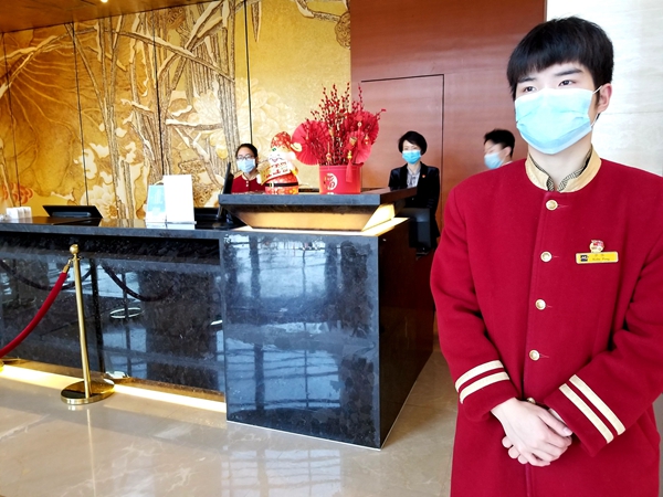“我很想回家,但我更愿意和大家在一起。”90后前台员工彭伟,是一名共青团员,是酒店实习生中的一员,年前就跟父母商量好回家过年,但礼宾部排班有困难,加之疫情突发,工作任务加重,他便主动请缨留在酒店和大家在一起,每天他的工作就是给来往的客人测体温,提醒客人各种防疫相关事宜,给酒店大堂消毒。