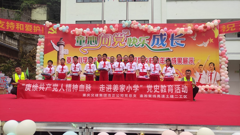 在党的百年华诞来临之际,为让红色精神在少年儿童心中生根发芽,5月31日上午,浩正公司党总支和渝湘复线高速公路土建二工区,受重庆市巴南区姜家小学邀请共同迎接“六一”儿童节的到来,开展了以“赓续共产党人精神血脉,走进姜家小学”为主题的儿童党史学习教育,厚植青少年爱党、爱国、爱社会主义的家国情怀,传播“党爱少年儿童,少年儿童爱党”的双向思想。
