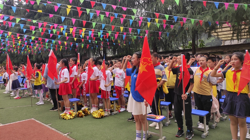 “我们是共产主义接班人,继承革命先辈光荣传统,爱祖国,爱人民,鲜艳的红领巾飘扬在前胸……”一曲优美激昂的《少先队队歌》拉开了活动序幕。少先队员向与会领导敬献红领巾,奏唱国歌,出队旗,奏唱《中国少年先锋队队歌》。庄严的仪式,让爱国主义的精神基因根植于心。