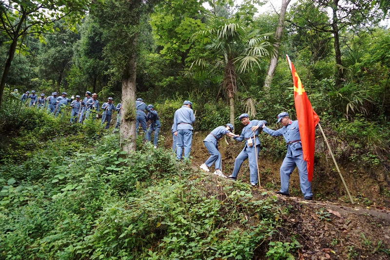 綦江是中央红军长征在重庆的唯一过境地。为身临其境感受红军长征路过该地的氛围,公司党委决定采取沉浸式学习的方式,党员们统一换上了红军行军装参加学习。大家手拄竹棍,在陡峭湿滑的山路上搀扶前行。途经附近农家,老乡亲切地为大伙端来红军茶和茶叶蛋,大家用土碗喝茶、吃茶叶蛋,真切地感受到军民之间的情谊。一个多小时的路程,同志们纷纷感叹当年的红军是何其艰苦。“亲身走过革命先辈的长征路,才正在体会到‘而今迈步从头越’的气魄和‘三军过后尽开颜’的喜悦,真正体会到长征是宣言书、宣传队、播种机的含义。”项目经理周光棋感慨道。