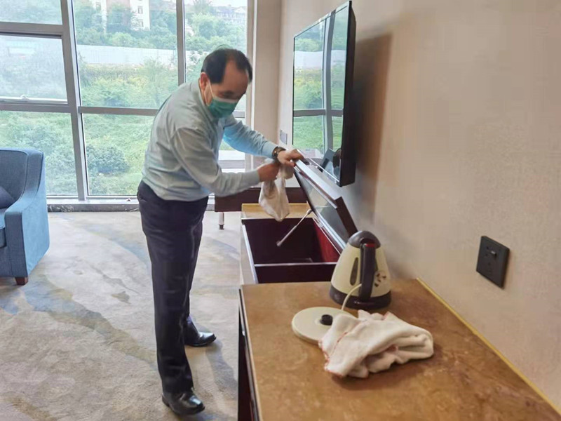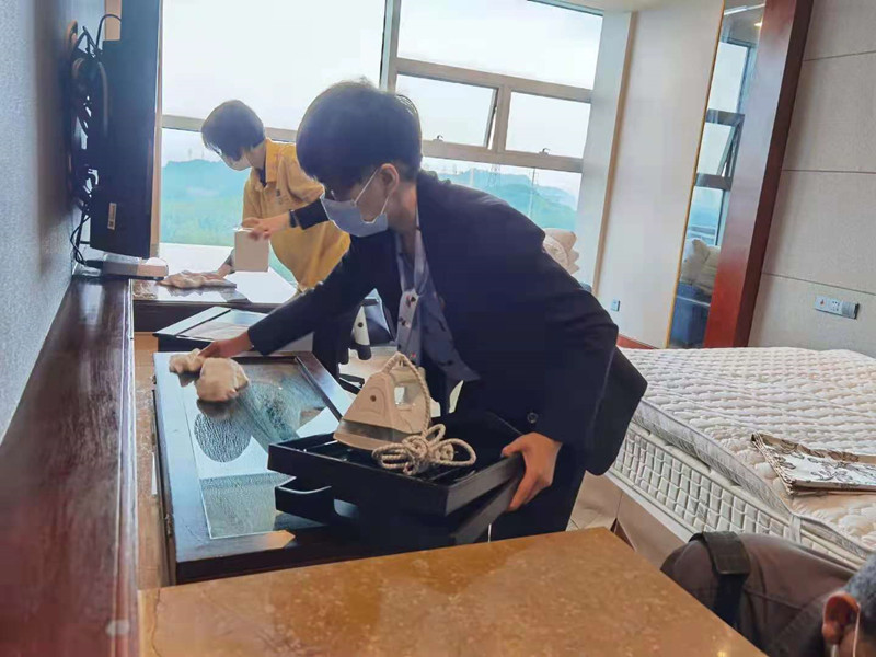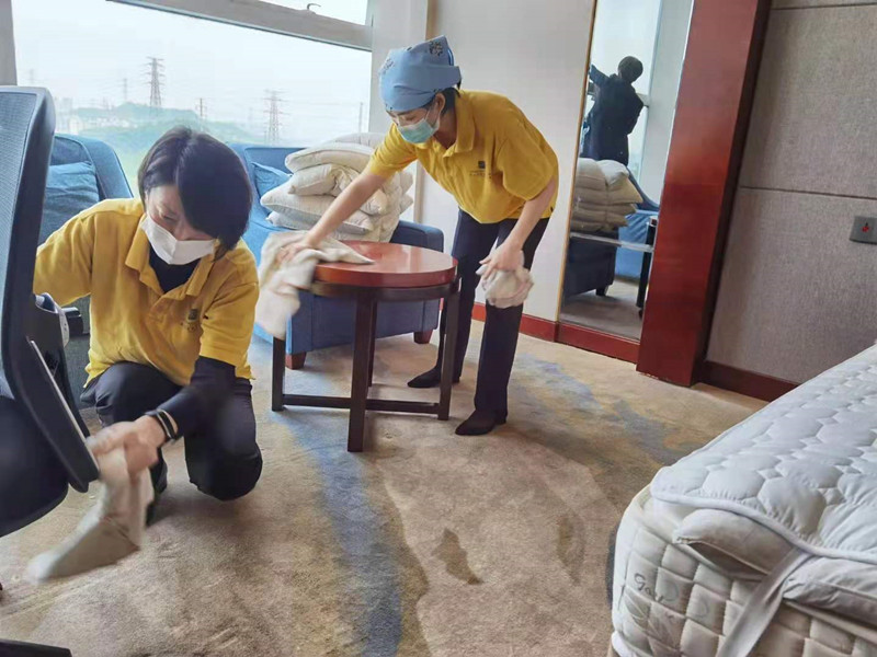 酒店五一期间入住率较高,为给来渝旅客创造良好的入住环境,酒店全体管理层、党员、团员青年代表连续3天带好工具走上楼层,协助客房部员工对过道、公共区域、硬件设施设备、房间进行细致清洁。在大家的共同努力下,间间客房窗明几净,焕然一新,喜迎各方宾客。