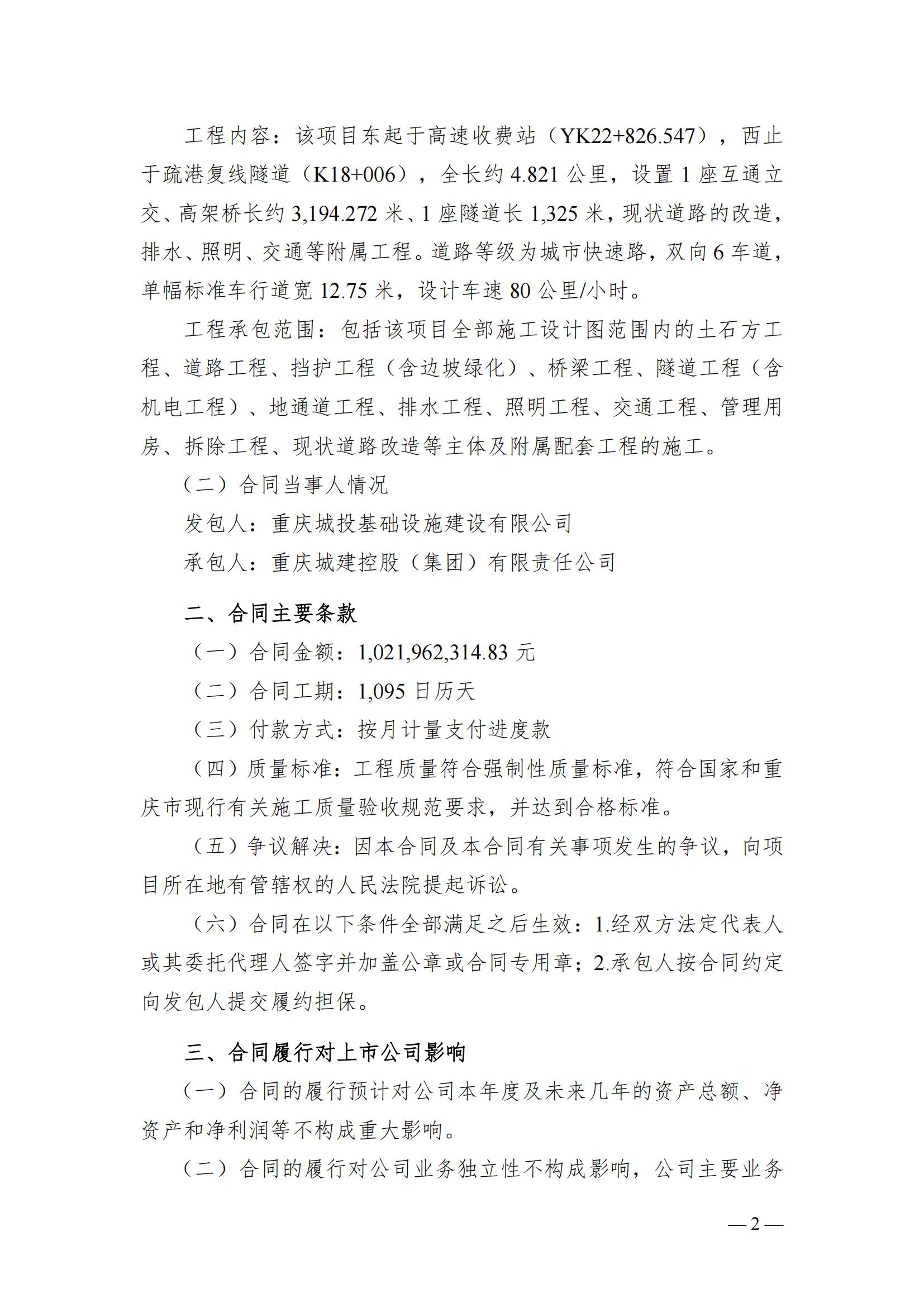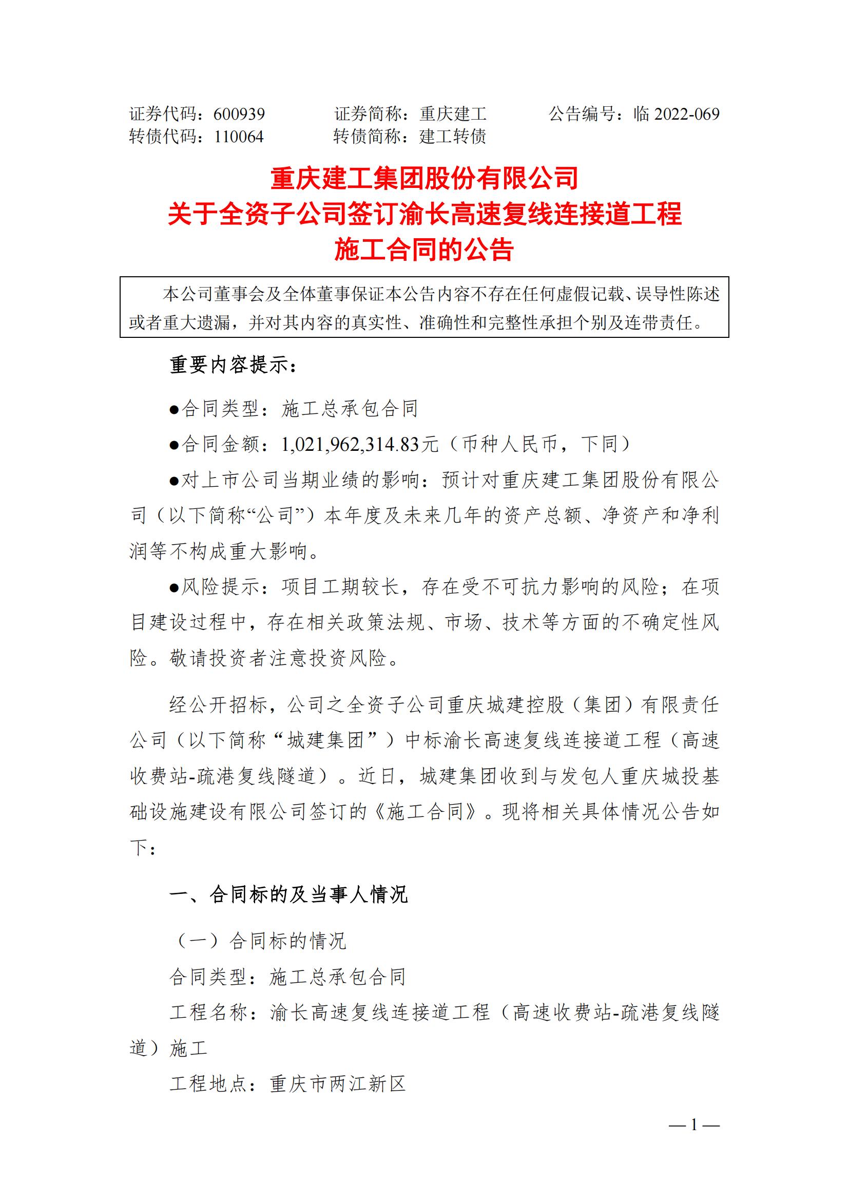 关于全资子公司签订渝长高速复线连接道工程施工合同的公告
